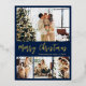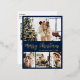 Elegant Calligraphy Minimalist Navy and Gold Foil Script 4 Photo Collage Merry Christmas Holiday Postcard. This festive, mimimalist, whimsical four (4) photo holiday card template features a pretty photo collage. The „Merry Christmas” greeting text is written in a beautiful hand lettering brush script font type in gold on navy blue colour background. On the reverse side with greeting text template with a little heart doodle on white and one photo template. Pretty greeting card for your family and friends in Christmas Holiday season.