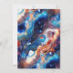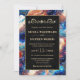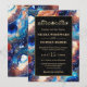 Create a bold and mesmerising statement with this elegant wedding design featuring a vibrant blue celestial agate-inspired background accented with shimmering gold details. Swirling marble textures blend deep navy, bright teal, warm amber, and soft ivory tones, evoking a cosmic, galaxy-like aesthetic. The refined gold frame and delicate ornamental flourish add timeless sophistication, while scattered gold flecks enhance the luxurious, starry effect.