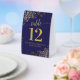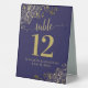 These beautiful table tent signs will make it easy for your guests to find their tables at your wedding reception. The elegant navy blue and gold design features lacy script calligraphy with ornate floral curls and swirls in the corners. There is space for the names of the couple and the wedding date.