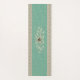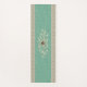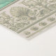 An elegant, diamond shaped gold gem with ornate frame surrounding it on a jade backdrop with a decorative tan matching border. Stunning and chic