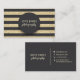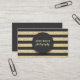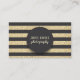 Elegant business card featuring gold glitter and black stripes on card front with circle for name and title placement. Back of card is solid black with name, title, icons, and contact details. The black on stripes and background is more of a deep smoke grey rather than solid black. The deep smoke grey adds more elegance to the card. Completely customisable, you can even remove the back colour if desired.