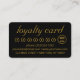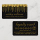 Elegant gold and black classy loyalty business cards for hair and makeup—with luxury gold glitter drippings and a modern black background. You can change the font/colour. The 50% off discount code can be changed.