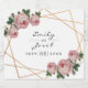 The design features an elegant faux gold glitter geometric frame pattern. Overlaid with watercolor pink roses and greenery foliage on two corners. Personalise this template to add your information. Click to customise further to make more changes. Everything is customisable.