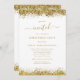 Elegant Gold Glitter Script White Christmas Party. Available digitally and printed. A touch of sparkle with faux glitter gold border is on each side top and bottom on a white background, and the word “invited” is in a stylish script with swashes. Keep the spaces each end of this text to maintain the swashes. Easily personalise the text to your own details. You can also change the text and background colours via the customise further option if you wish.