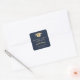 Formal dark blue graduation sticker for your graduation announcements, party invitations and thank you cards featuring a gold grad cap and the graduate's name, school and class year in modern gold serif typography.