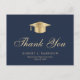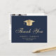 Elegant dark blue graduation thank you postcard featuring a gold grad cap, "Thank You" in a formal gold script, and the graduate's name, school and class year in classic gold serif typography. On the back, upload a photo and personalise your thank you message or leave blank for a handwritten note if desired.