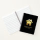 Spiral notebook with a simple image of a gold gradient house on a black background. Elegant minimalist design.