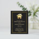 A graduation invitation postcard with a simple image of a gold gradient house on a black background. A faux gold foil frame surrounds the design. Elegant and minimalist.