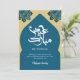 Celebrate the joyous occasion of Eid al-Fitr or Eid al-Adha with this stunningly elegant greeting card. Featuring a sophisticated deep teal Islamic arch (mihrab) framed against a delicate white geometric pattern background, this design is accented with luxurious 3D-style gold and blue floral mandalas.