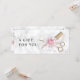 Modern and elegant gift certificate for hairstylists with faux gold scissors & comb, pink and white roses, white marble background and elegant calligraphy font.