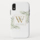 Elegant watercolor floral greenery monogram name iPhone XR case featuring a gold monogram initial. Designed by Thisisnotme©