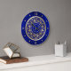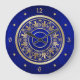 This elegant wall clock features a center ornate gold design pattern which is framed in a shiny gold circle that separates the pattern from the numbers and diamonds on the perimeter. Everything is placed on a beautiful blue gradient background.