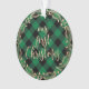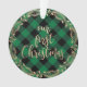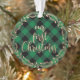 Cosy and modern personalised First Christmas ornament with elegant faux gold handwritten script lettering, beautiful wreath and classic black and green plaid texture. Personalise the product with the year, the family name and your favourite wedding photo.