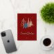 Send your holiday wishes in style with this elegant personalised Christmas card and matching envelope set. Featuring a modern graphic Christmas tree design in shimmering gold with soft blush accents against a rich red background, a Seasons Greetings message and the year; this card is both classic and contemporary.