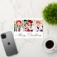 Simple Christmas card featuring three vertical photos with "Merry Christmas" displayed in a festive gold foil calligraphy script. Personalise the front of the multi-photo Christmas card with your family name and the year. The card reverses to display a modern navy and white plaid pattern.