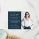 Elegant Gold Script Navy Blue Graduation Photo Thank You Card