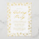 Elegant holiday party invitation with a border of gold foil snowflakes and pine branches on a white background. "Holiday Party" is displayed in a gold foil calligraphy script with your party details shown below. The snowflake holiday party invitation reverses to display a beautiful snowflake pattern.