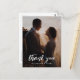 Stylish wedding thank you postcard template featuring a photo on the front with the text "Thank You" in a modern script font in white on top of the picture. There are faux gold shimmery sparkles on the edges of the card. Custom thank you message and returning address on the back of the card. Elegant and modern design.