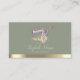 Professional fashion stylist business card featuring a beautiful sewing machine with flowers and an elegant gold stripe on a sage green background. Add your name and contact details to make a lasting first impression.