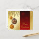 A noble and elegant Christmas illustration: golden christmas tree branches with hanging christmas baubles on a red-golden background with Merry Christmas wishes.