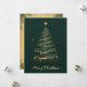 This elegant Christmas greeting card features a beautifully designed golden Christmas tree set against a dark green background. The tree is adorned with delicate golden ornaments and topped with a shining star. The intricate design includes shimmering golden lines and sparkles, creating a festive and luxurious feel. At the bottom of the card, the words "Merry Christmas" are written in an elegant golden script, adding a warm and joyful touch to the overall design. This card is perfect for sending holiday wishes to friends and family, capturing the essence of Christmas with its sophisticated and festive look. The back of the card continues the festive theme with a vintage-style design. It has an aged paper texture, bordered by green pine branches. The centre is blank, providing ample space for writing a personal message, adding a touch of nostalgia and charm.