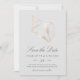 Notify guests of your upcoming destination, beach, or tropical island wedding with these beautiful summer save the date cards featuring a faux gold foil conch shell illustration on a soft pale grey background. Elegant dark gray script and block lettering displays your wedding details (names, wedding date, location, and website).