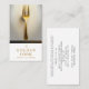 An elegant gold fork-themed business card for an event caterer is a sophisticated and tasteful choice that immediately communicates a sense of luxury and culinary expertise. The centerpiece is a prominently featured gold fork, elegantly designed and shining with a metallic finish. Customise with your company name. List your services on the back of the card, or create a tagline that fits your business.
