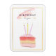 Elegant and stylish golden frame with a birthday cake slice with candles and a pink paint strokes with a happy birthday wish.
