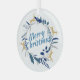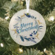 This elegant Christmas ornament features a wreath with golden reindeer and blue and grey greenery. Merry Christmas is written in a beautiful handwritten script.