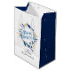 This elegant Christmas gift bag features a wreath with golden reindeer and blue and grey greenery. Merry Christmas is written in a beautiful handwritten script.