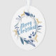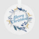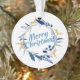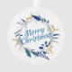 This elegant Christmas ornament features a wreath with golden reindeer and blue and grey greenery. Merry Christmas is written in a beautiful handwritten script.