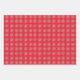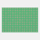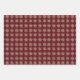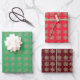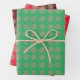 Christmas wrapping paper in green, red, and burgundy background with elegant golden snow flakes designs.