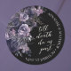This moody and romantic round sticker is perfect for favor labels or envelope seals. The top left features a soft arrangement of deep purple, dark gray, and black flowers and leaves for a subtle boho gothic touch.