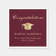 Elegant burgundy red graduation party napkins featuring a gold grad cap, "Congratulations" in a classic calligraphy script and the graduate's name, school and class year in modern typography.