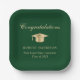 Elegant green graduation party paper plates featuring a gold grad cap, "Congratulations" in a classic script and the graduate's name, school and class year in modern typography.