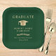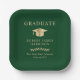 Elegant green graduation party paper plates featuring a gold grad cap, "Graduate" and the graduate's name, school and class year in classic serif typography.