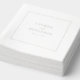 These wedding napkins feature a minimalist and elegant design with a clean, off-white background. The layout includes a simple rectangular border framing the text, which is presented in a refined serif font with soft gray tones that add subtle sophistication. The composition emphasizes negative space, creating a calm and uncluttered appearance perfect for conveying important personal announcements. Ideal for weddings, these napkins exude understated elegance and are customizable to suit your special day.