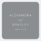 This square sticker features a minimalist and elegant design with a solid gray background, creating a sophisticated contrast for the crisp white text. The typography combines a formal serif font with a flowing cursive script, offering a balanced blend of formality and personalization. Perfectly centered alignment enhances symmetry and focus, making it ideal for event announcements or special occasions. The clean lines and ample negative space convey simplicity and refinement, ensuring clarity and impact without any additional graphics or embellishments.