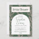 This stunning bridal shower invitation features a beautiful botanical theme, with a green background adorned with delicate light pink vines of leaves. The words "Bridal Shower," the bride-to-be's name, and the registry information are elegantly presented in a pretty green colour to match the background, while the rest of the text is in a sleek dark grey to provide a stylish contrast.
