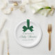 Celebrate in style with these elegant baby shower paper plates featuring a green watercolor ribbon and bow at the top of the design. “Baby Shower” appears in refined green calligraphy, with customizable text below for the mother-to-be’s name and shower date. Perfect for Christmas or winter baby showers, these plates add a festive yet timeless touch to your table décor.