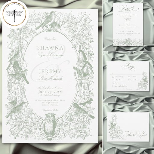 Elegant Green Chinoiserie Nature & Birds Wedding Invitation
