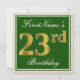 This simple and elegant birthday party invitation design features a personalised message like "FirstName’s 23rd Birthday" (with the "23rd" having a faux/imitation gold-like colouring look) within a green-coloured square area featuring a simple border outline. The name is in an elegant white-coloured script-like text, and can be customised. The back features customisable invitation details. A birthday party invitation like this could perhaps be used when inviting people to a birthday party being held for somebody who is celebrating their twenty third birthday. [~Z0000225]
