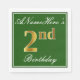 This simple and elegant paper napkin design features a message like "ANameHere’s 2nd Birthday" (with the "2nd" having a faux gold-like colouring) within a green-coloured square area featuring a simple border outline. The name is in a white-coloured script-like text, and can be customised. Napkins like these could perhaps be used at a birthday party for somebody who is celebrating their second birthday. [~Z0000137]
