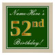 This simple and elegant birthday party poster design features a personalised message like "Name-Here’s 52nd Birthday!" (with the "52nd" having a faux/imitation gold-like colouring look) within a green-coloured square area featuring a simple border outline. The name is in an elegant white-coloured script-like text, and can be customised. A personalised birthday party poster like this could perhaps be used as a decoration at a party being held for somebody who is celebrating their fifty second birthday. [~Z0000235]