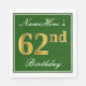 This simple and elegant paper napkin design features a message like "NameHere’s 62nd Birthday" (with the "62nd" having a faux gold-like colouring) within a green-coloured square area featuring a simple border outline. The name is in a white-coloured script-like text, and can be customised. Napkins like these could perhaps be used at a birthday party for somebody who is celebrating their sixty second birthday. [~Z0000137]
