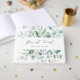 This wedding guest book features painted watercolor eucalyptus, botanical green, and light blue leaves with modern calligraphy.
