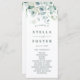 This wedding ceremony program features painted watercolor eucalyptus, botanical green, and light blue leaves with modern calligraphy.