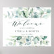 This wedding welcome sign features painted watercolor eucalyptus, botanical green, and light blue leaves with modern calligraphy.