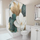 Large, white flowers with gold accents combine with green and gold foliage to create a beautiful and elegant design on this shower curtain.
