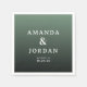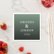 This wedding napkin design features a sophisticated gradient background transitioning from light to dark green, creating a serene and elegant atmosphere. The layout is clean and balanced, with centered text in a refined serif font that adds a touch of formality. Customizable placeholders allow for personalization with names, locations, and dates, making it perfect for weddings or formal events. The minimalist style emphasizes clarity and simplicity, ensuring the focus remains on the important details while conveying an overall mood of calm sophistication.